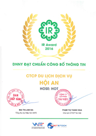 Công ty CP Du lịch - Dịch vụ Hội An - HOT vừa được bình chọn là “Doanh nghiệp niêm yết đạt chuẩn công bố thông tin 2016”, một phần của chương trình bình chọn “Doanh nghiệp niêm yết có hoạt động IR - Quan hệ Nhà đầu tư tốt nhất 2016” do Hiệp hội Các nhà Quản trị Tài chính Việt Nam - VAFE và Công ty Cổ phần Tài Việt - Cổng thông tin Tài chính Chứng khoán Vietstock.vn đồng tổ chức.